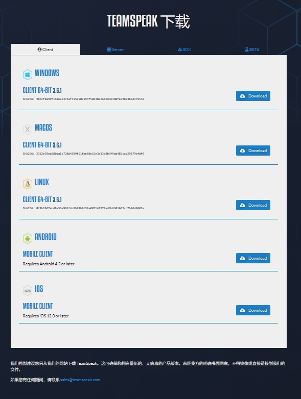 软件分为,服务器端和语音软件端,具体下载网址为这个:https://teamspeak.com/zh-CN/ (下载需要科学上网)友情提示,这个才是官网,有个中文站那个下载的不是正版。