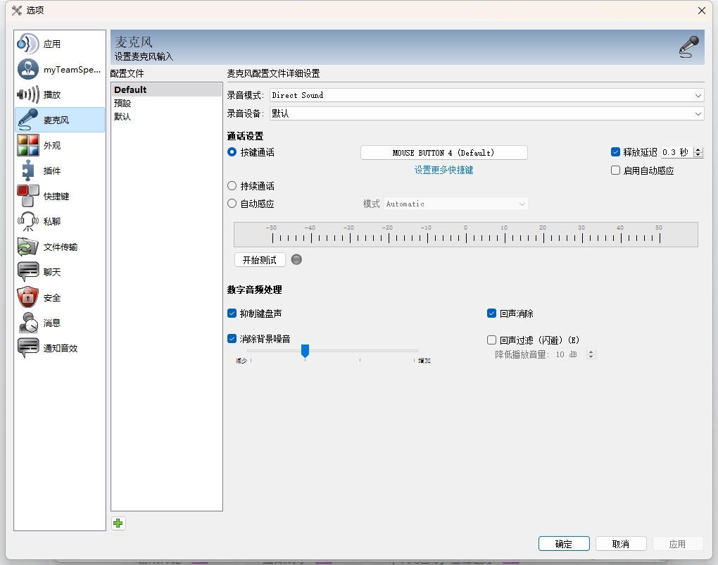 麦克风录音设备默认,或自己选择,通话设置可自定义,这里解释下释放延迟(仅按键通话可以使用,按下按键0.3秒后,说话才有效,可防止误触),设置感应说话,开启自动感应,下面数字音频处理建议打勾,消除背景噪音,自己按需求测试。(降噪我感觉来说,比某Y要好上一点)