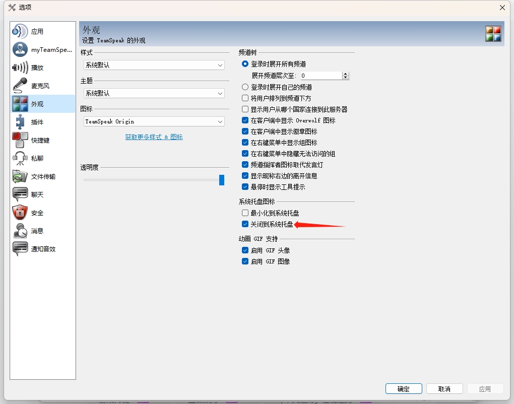 外观设置,系统托盘图标,默认的是选择第一个,你一点×,TS直接就关了,这里建议选择第二个。基本设置就这些,接下来是软件基本使用方法
